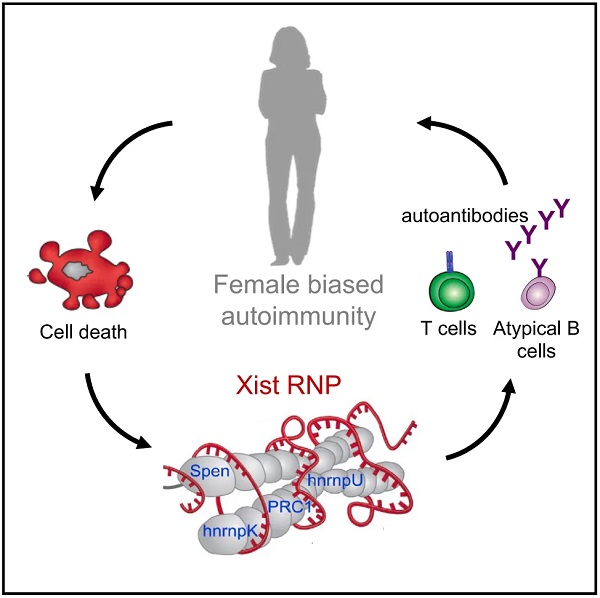 女性的两条 X 染色体会随机失活一条,该研究表明,调控雌性的 X 染色体中的一条随机失活的长链非编码 RNA(lncRNA)——X-ist,其与多种 RNA 结合蛋白结合形成 X-IST-RNP,其包含的多种自身抗原成分导致了自身免疫。由于 X-ist 只在人类和雌性哺乳动物细胞中表达,因此驱动了性别偏倚自身免疫。