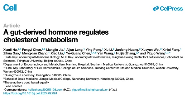 2024年3月18日,清华大学生命科学学院王一国团队与南方医科大学南方医院张惠杰团队合作,在 Cell 期刊发表了题为:A gut-derived hormone regulates cholesterol metabolism 的研究论文。