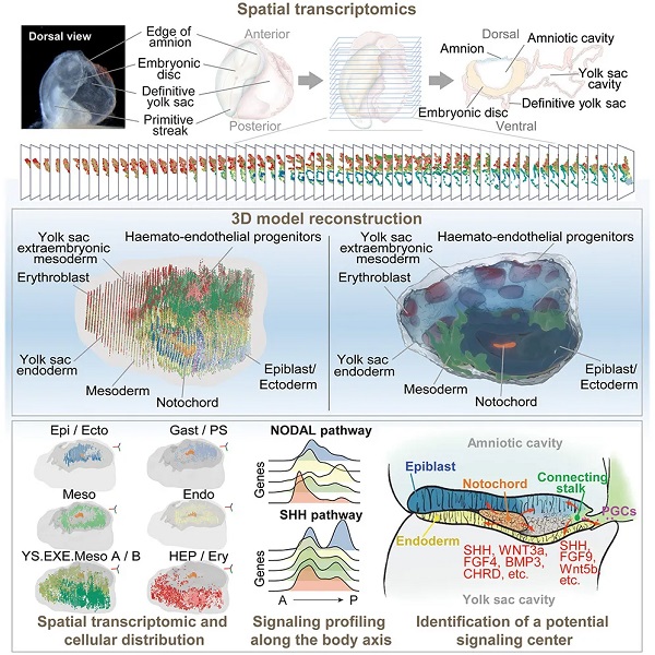 该研究基于一枚珍贵的 CS8 时期完整人类胚胎,利用连续横断面高分辨空间转录组切片,结合机器学习算法进行三维对齐,构建了完整胚胎中不同细胞类型与基因表达的三维空间分布点云图,进而数字 3D 重构了首个完整人类原肠胚模型。