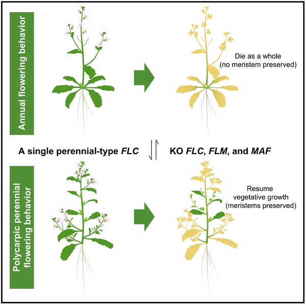 在这项研究中,研究团队首先建立了两个多年生模式植物,使之与近缘一年生植物杂交,构建起两个跨物种遗传群体,再采用正向遗传学手段定位到了三个决定植物多年生的 MADS-box 基因(FLC、FLM 和 MAF)。